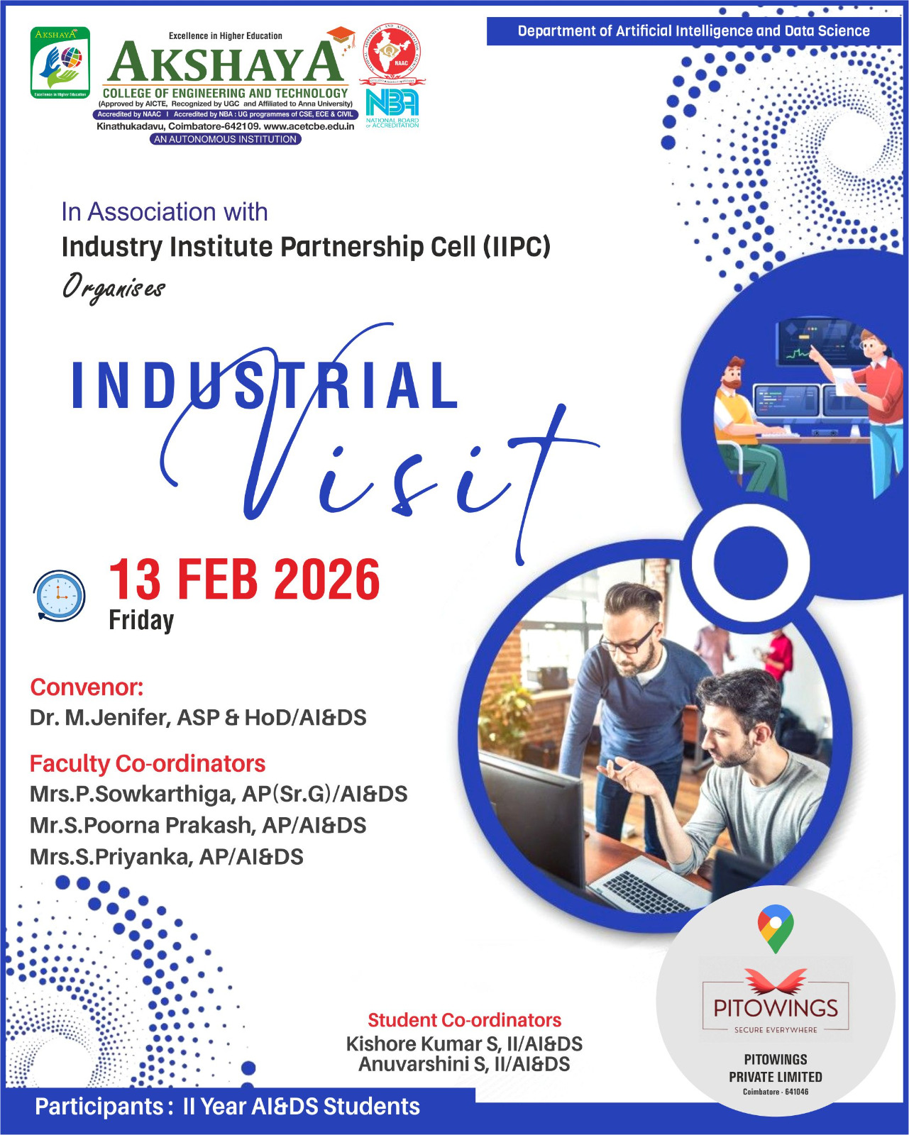 The II Year AI&DS students visited Pitowings Private Limited, Coimbatore. The visit provided valuable exposure to industry practices, real-time applications, and emerging technological trends.